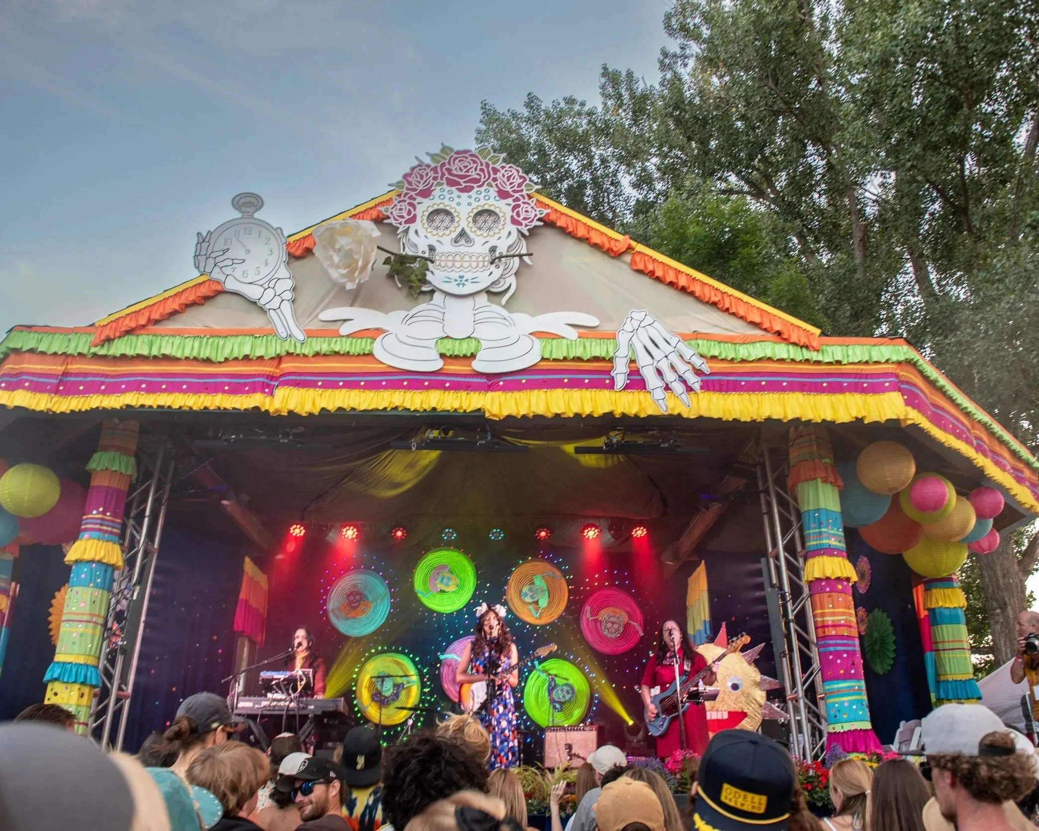 “The skeleton was a big team effort, as is every year for Mountain Fair. I have never considered myself a big "ideas" guy. But I am really good at bringing ideas to life. The broad stroke stage ideas for the Mountain Fair stage always come from Carbondale Arts crew with an interpretation by Loren Wilder. Loren has a magical way of looking at the world and expressing ideas. The physical drawings and art were done by Brett Haynes of Bonedale Tattoo. He's an incredible artist and when I saw Loren's idea, I knew his art would fuse well with the overall project. When it comes to the actual custom video that brings everything to life, I always turn to my best friend Wylie Chenoweth. Wylie and I have been building art together since the beginning. So once I got the broad idea from Loren, the artwork from Brett, and video content from Wylie, it's up to me to physically build the parts we need for the stage, set up the show files for the performance, do the technical projection mapping, and then run the show live.