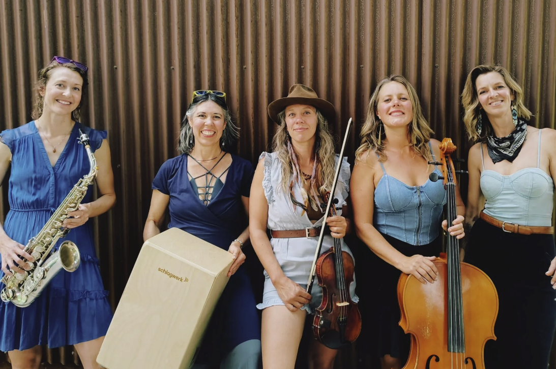 With their honeyed harmonies and solid groove, Mama Lingua warms the crowd like a good draught of elderflower mead under a full moon. Original folk and world tunes with guitar, violin, cello and percussion.